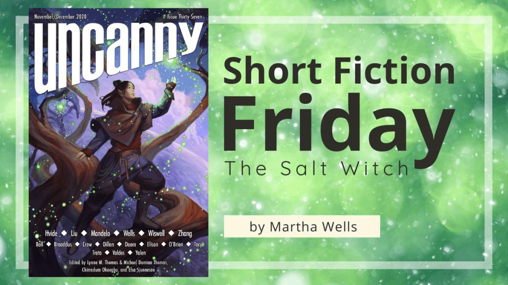 In The Salt Witch, Martha Wells explores the intersection between heritage and individuality within a patriarchal culture. Juana, a witch attempting to traverse the sea in a broken sailboat, instead finds herself washed ashore a ghost island filled with the victims of a hurricane and held captive by a malevolent force residing in its center.